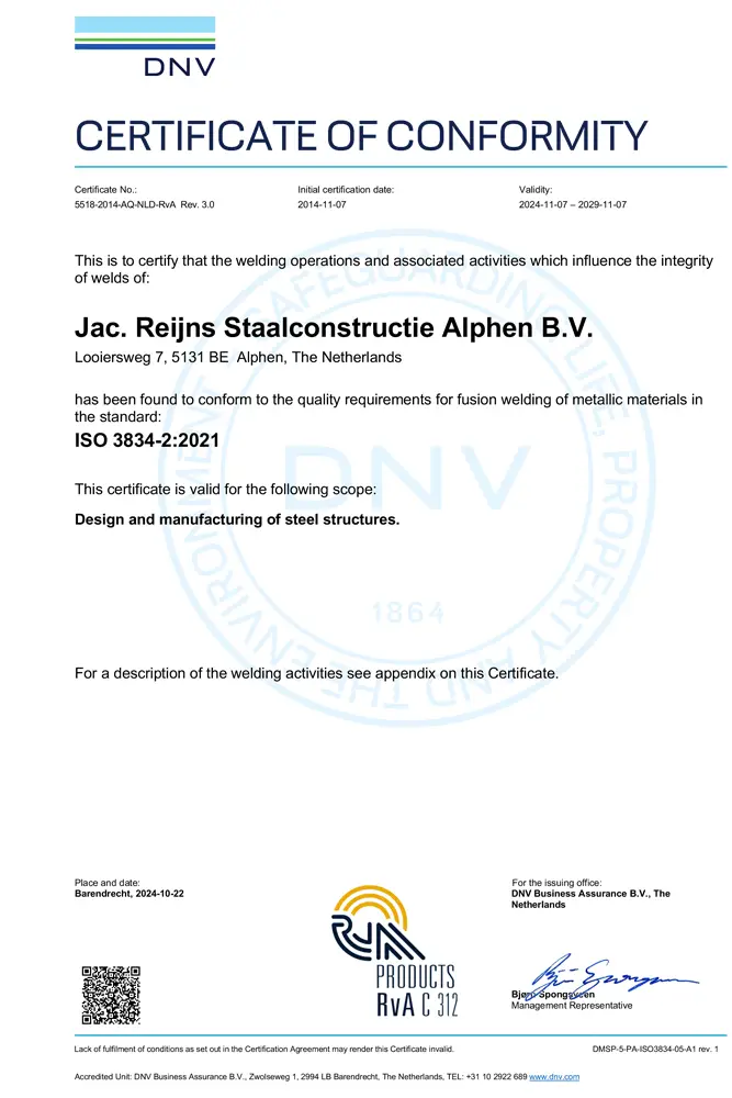 Jac Reijns Staalconstructie Alphen b.v. is sinds 2014 gecertificeerd door accreditatie instantie DNV G. Hierdoor zijn we gecertificeerd om te engineeren én te produceren conform deze norm. Dit tot en met EXC3!
